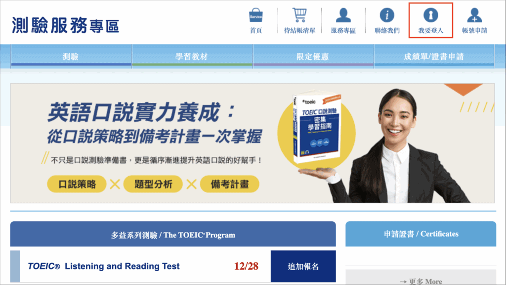 步驟 1:前往多益測驗服務專區,點選「我要登入」,使用報名時註冊的帳號密碼登入。
