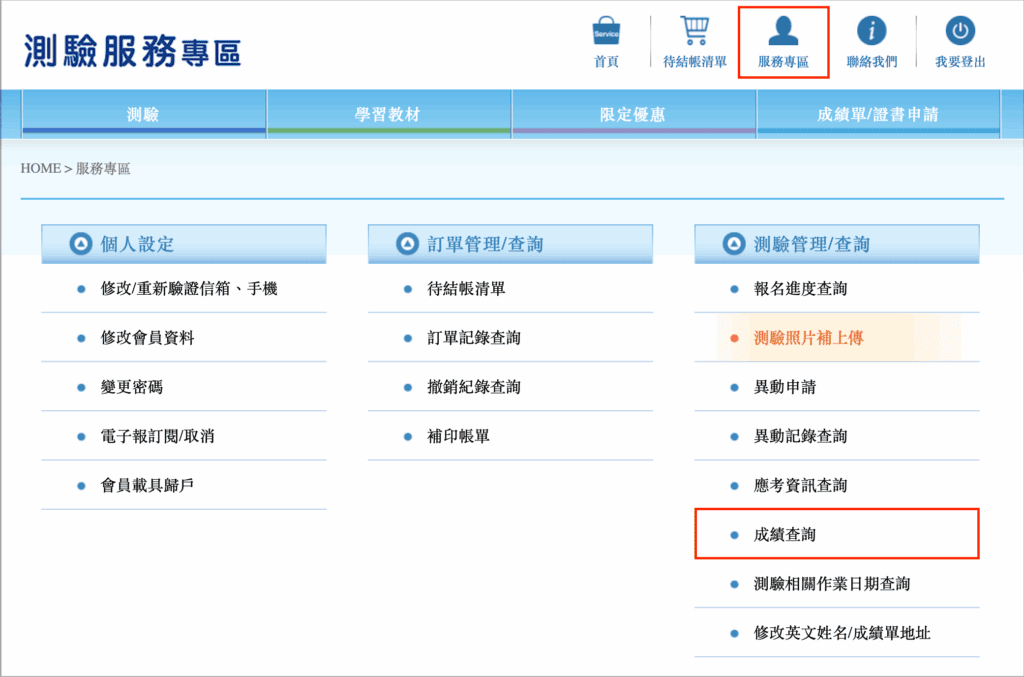 步驟 2:進入「服務專區」,點選「成績查詢」。