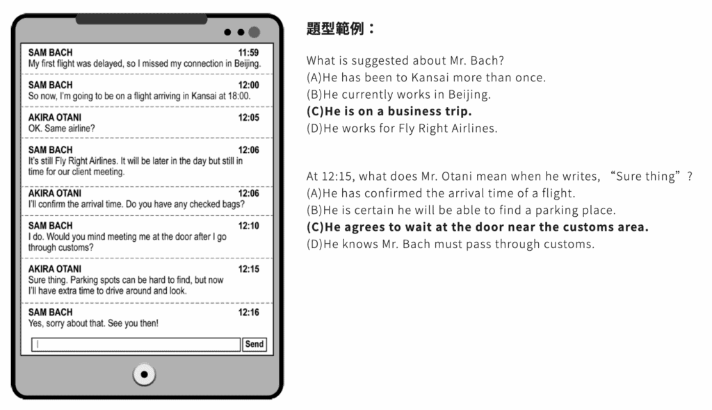 多益官方網站舉例,題目中開始會出現通訊軟體對話,符合現今真實情境。