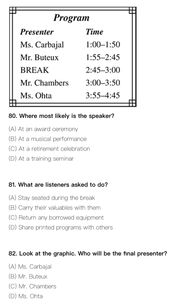 第二種是圖表題,會在題本上提供圖表(如價目表、時刻表、座位圖等),聽力內容會提到圖表中的資訊,你必須「一邊聽、一邊看圖表、一邊找答案」,準備時要練習快速掃視圖表、抓取關鍵資訊的能力。